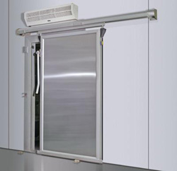 门扇的开启与关闭采用手动推拉平移式,顶部轨道采用曲线形式,当门关闭到位时,门扇自动压紧地坪及门框。保证了良好的密封性能。开启时,门扇同步离开门框,并上升,减少了密封橡胶条与门框、地坪的摩擦。门扇四周内有低电压电加热器,防止在低温下门扇与门框的冻结。