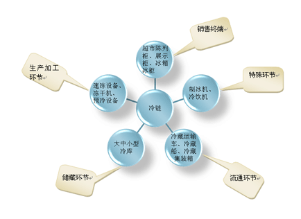 4.冷链终端销售环节:一条完善的冷链服务终还是要回到销售产品,如何让销售产品的货架期更长, 冷柜、岛柜、展示柜等是必不可少的。